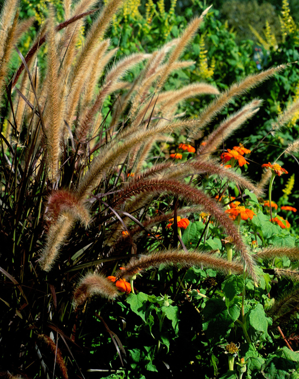 Ornamental grasses like Miscanthus and Pennisetum add to the late-season smorgasbord. Let Mother Nature feed the birds by allowing the graceful flower plumes to mature and set seed. The foliage, too, is bird friendly. It provides late-season cover.