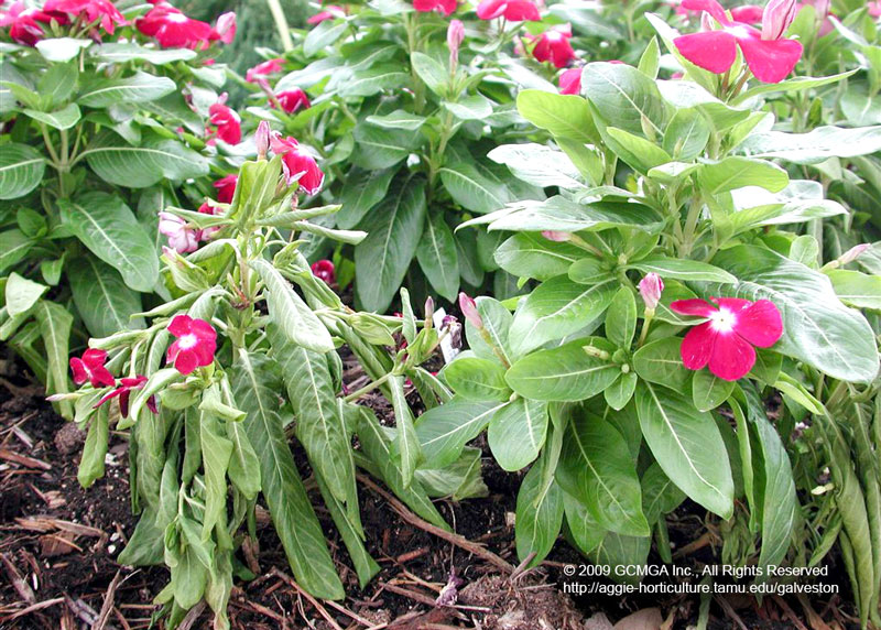 Answer: I wish you had attached a photo. I’ll include one in the absence from the Galveston County Master Gardeners. It’s the disease I see just about 100 percent of the time when periwinkles start to fail. This is aerial Phytophthora, a fungus, not a virus. It has been responsible for landscapers’ avoiding periwinkles for several decades. Then, a selection known as Cora vincas was introduced and declared to be resistant to this disease. After a few years, however, even those began to succumb. A few years later an improved collection was introduced – Cora XDR (“extra disease-resistant”). It has proved to be a distinct improvement.
