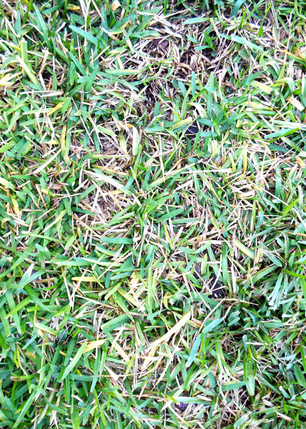 Question: My St. Augustine has gone from lush and green in the spring to a mixture of green and dead blades now. I find no chinch bugs and only an occasional grub worm – not the 5 per sq. ft. it takes to do damage. Is this TARR or brown patch? Or a virus? Alison T., Austin.