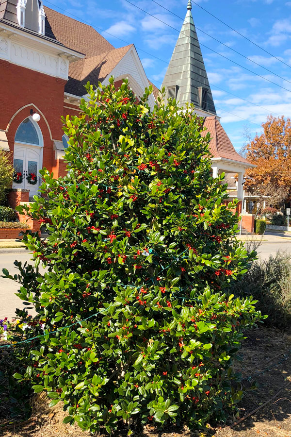 • Nellie R. Stevens holly. I’ve grown this beautiful shrub since 1970, and I can’t imagine my landscape without it. It grows at a decent pace to a height of 15 to 18 feet (taller with age and perfect conditions), and it bears large red berries that persist all winter. I plant mine about two-thirds as far apart as I’ll be letting them grow (10 feet apart, for example, if they’ll be growing 15 feet tall). It’s available in a wide range of sizes in nurseries. Sun or shade.