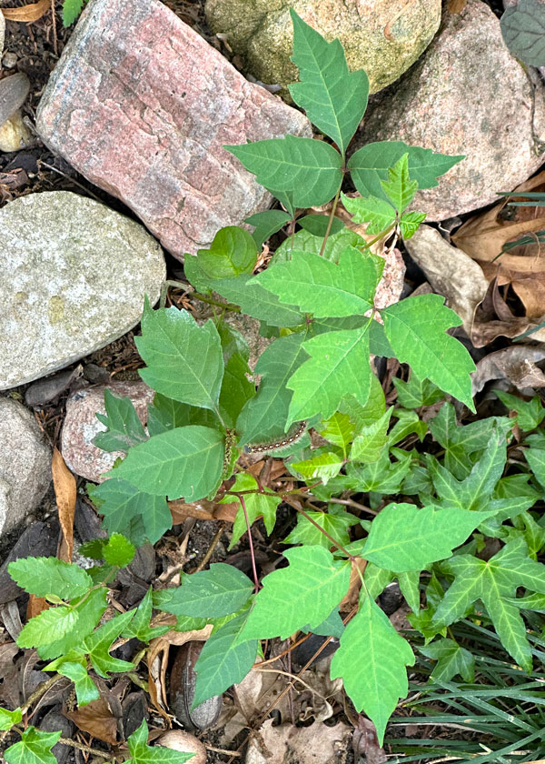 On the left is a seedling of poison ivy. We live in a wooded rural area, and as much as I’d like to eliminate it from the property entirely, 55 years and counting haven’t been enough. Birds consume the seeds and “plant” them abundantly.
