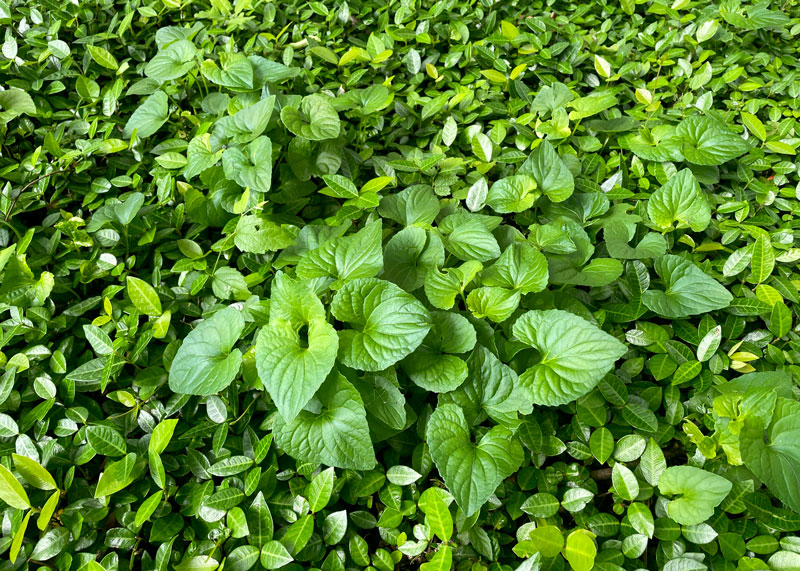 Answer: You have wild violets. There are two options. One would be to use a broadleafed weedkiller with a sponge and rubber gloves. Carefully soak the sponge in the mixed herbicide, wring it to where it won’t drip freely, then wipe it across the leaves of the violets. They are taller than the jasmine, so you should be able to coat them without getting the weedkiller onto your groundcover. You might have to repeat the treatment in 10-15 days.