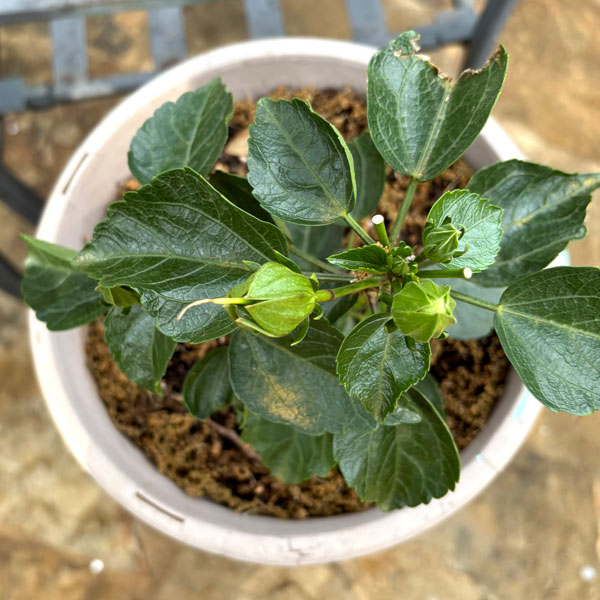 Answer: It sounds like you’ve done everything correctly. They like really warm weather and they need full sun. If anything, you might have over-potted them. Hibiscus plants tend to bloom best if they’re slightly pot bound. They produce their buds on new growth, so use a high-nitrogen, water-soluble plant food to keep them growing actively. Feeding them every 10-14 days should be adequate for now, switching over to weekly when they get larger and start drying out more quickly.