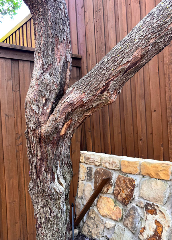 Answer: Sadly, cabling would not help. If you look at the right-hand branch, it’s losing its bark. It also has about half as many leaves as it should have, so it’s on its way out, and the trunk is showing signs of following closely behind. I see that you already have one nice crape myrtle growing there. You don’t have a lot of room for a standard tree in that corner, so I might be tempted, if I could match that crape myrtle variety, to buy another large one (must be the same variety!) and create a sort of grove with them. If you really want a tree, the best options would probably be a Teddy Bear dwarf southern magnolia or a tree-form Nellie R. Stevens holly if you could find one already grown to a nice size. That’s a really pretty setting you’ve created. I believe any of those three options would work well.