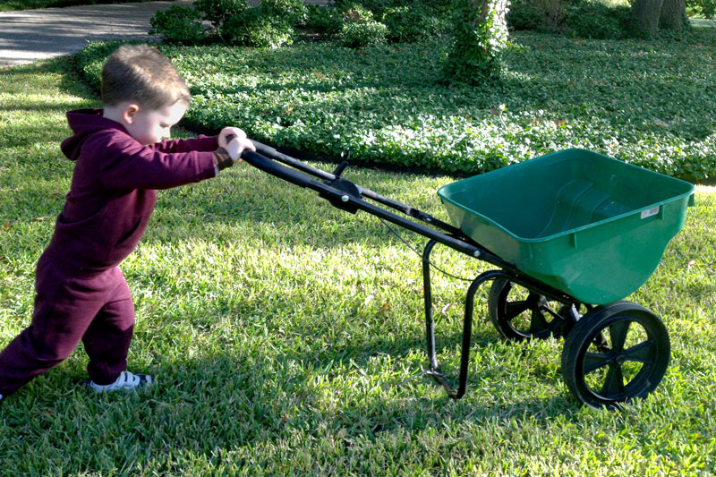 • Trees: Same schedule as turfgrass. In fact, they will compete with the turf for nutrients so no need to make special effort to feed them. Perhaps make one extra pass around the drip line with the rotary spreader. Be certain you’re not using a weed-and-feed product.